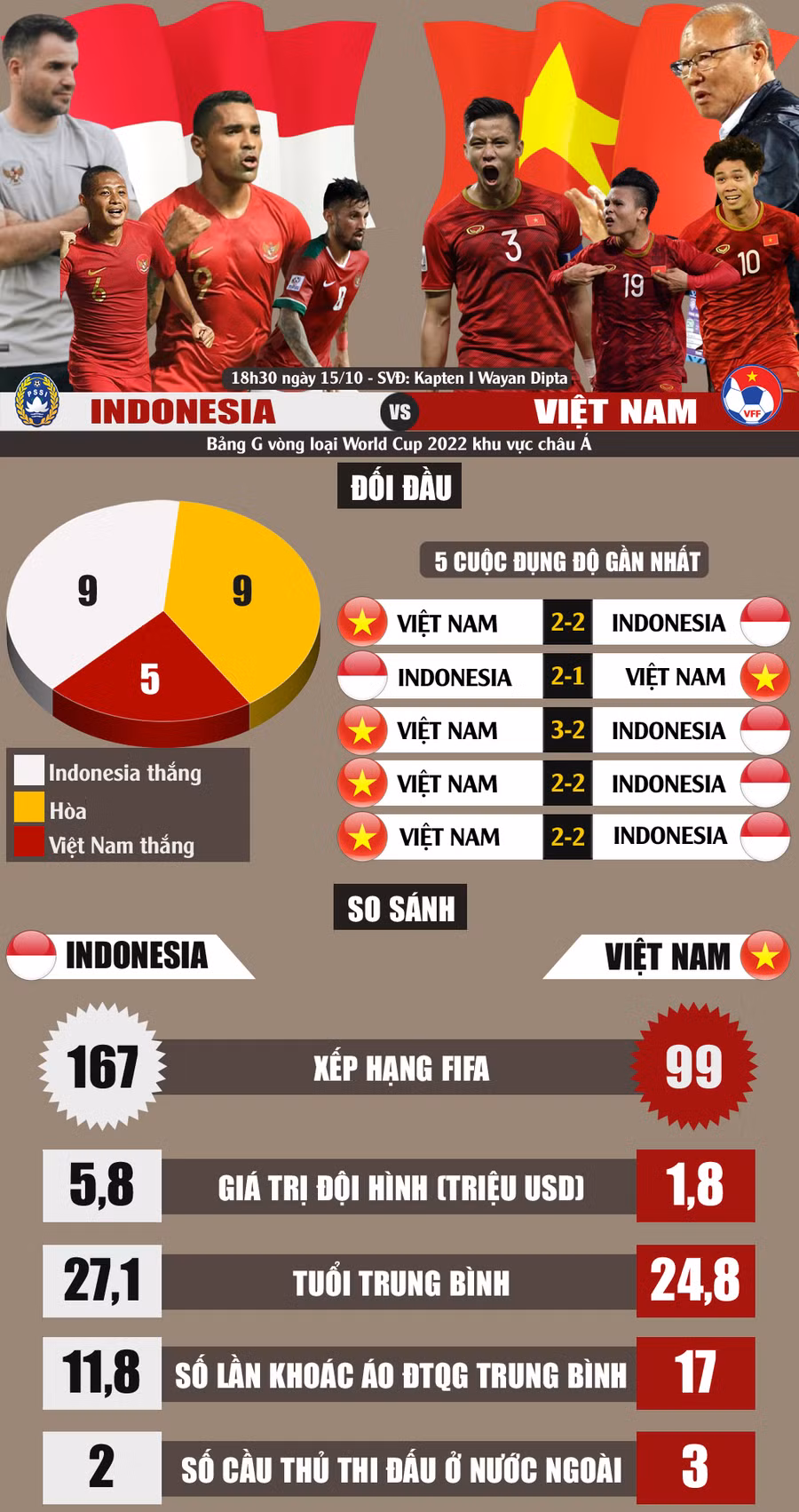 Nhìn lại quá khứ, có thể thấy Indonesia chưa bao giờ là đối thủ dễ chơi với Việt Nam. Tính từ năm 1991 tới nay, qua 23 màn đụng độ Indonesia ở cấp đội tuyển quốc gia trên mọi đấu trường, Việt Nam chỉ có vỏn vẹn 5 lần giành chiến thắng.