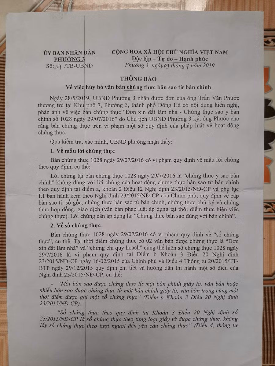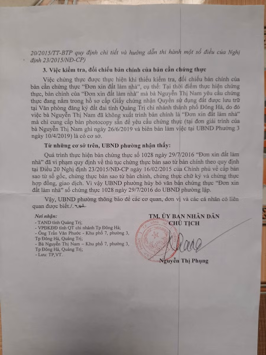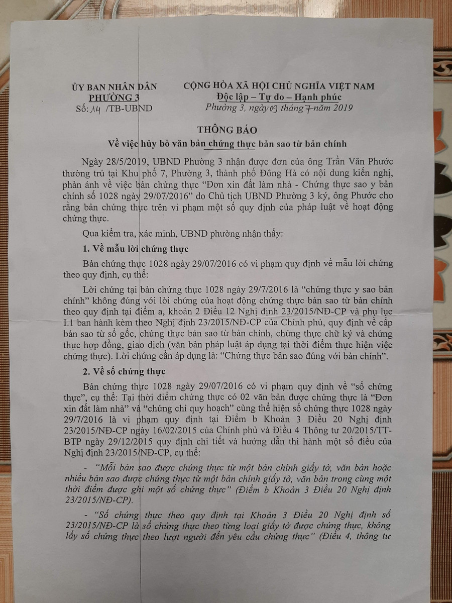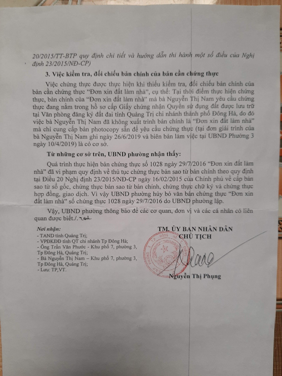 Trong Thông báo số 14/TB-UBND, ngày 9/7/2019 của Chủ tịch UBND phường 3, bà Nguyễn Thị Phụng gửi TAND tỉnh Quảng Trị, Văn phòng đăng ký đất đai tỉnh Quảng Trị - Chi nhánh TP Đông Hà và ông Trần Văn Phước đã nêu rõ vấn đề. Theo đó, ngày 28/5/2019, UBND phường 3, TP Đông Hà có nội dung kiến nghị, phản ánh về việc bản chứng thực “Đơn xin đất làm nhà” - chứng thực sao y bản chính số 1028 ngày 29/7/2016 do Chủ tịch UBND phường 3 ký, ông Phước cho rằng bản chứng thực trên vi phạm một số quy định của pháp luật về hoạt động chứng thực.