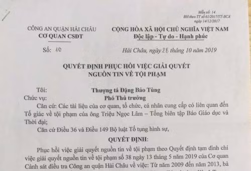 Quyết định Phục hồi việc giải quyết nguồn tin về tội phạm số 10, ngày 28/10/2019 do Thượng tá Đặng Bảo Tùng- Phó thủ trưởng Cơ quan CSĐT Công an quận Hải Châu, TP. Đà Nẵng ký nêu rõ là Phục hồi việc giải quyết nguồn tin về tội phạm theo QĐ tạm đình chỉ việc giải quyết nguồn tin về tội phạm số 38 ngày 13/5/2019 của Cơ quan CSĐT Công an quận Hải Châu.