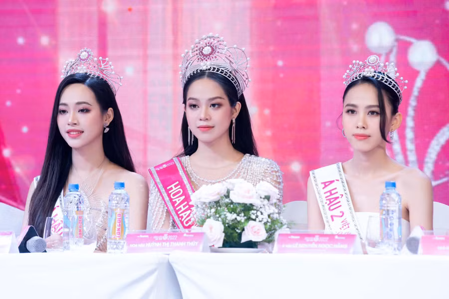 Sáng 24/12, Hoa hậu Việt Nam 2022 Huỳnh Thị Thanh Thủy cùng Á hậu 1 Trịnh Thùy Linh và Á hậu 2 Lê Nguyễn Ngọc Hằng bước vào buổi họp báo đầu tiên sau khi đăng quang.
