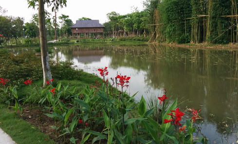 | Khuôn viên tươi xanh và bể bơi tại EcoPark |
