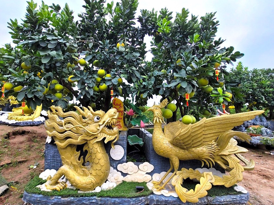 | Những tác phẩm bưởi cảnh như 'Miêu tài đa lộc', 'Long phụng sum vầy'… được hoàn thiện sẵn sàng phục vụ người dân đón Tết. |