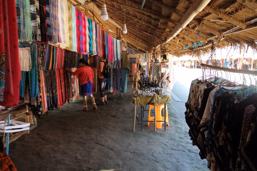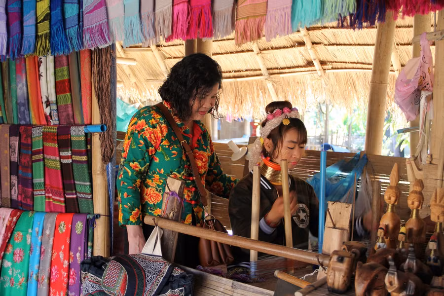 Người cổ dài Karen dệt vải, khăn choàng, làm các đồ thủ công mỹ nghệ để bán cho khách du lịch.