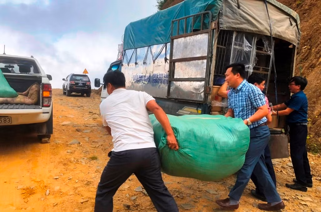 Đường lên bản Sài Khao dốc cao khúc khuỷu, xe tải chở hàng không lên được, các thành viên trong đoàn thiện nguyện và lãnh đạo huyện Mường Lát phải cùng nhau sang tải và đẩy xe. Video Ngọc Nam