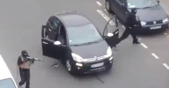 Theo một số nguồn tin, 2 người mang súng Kalachnikov và súng phóng rocket đã xông vào tòa soạn tạp chí biếm họa Pháp Charlie Hebdo. Sau đó, tiếng súng vang lên liên tục.
