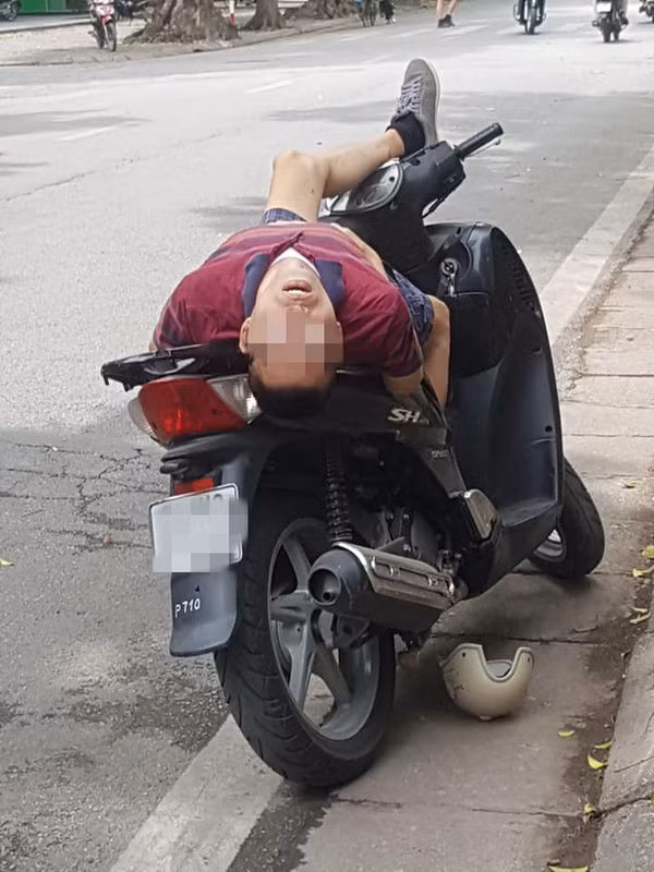 Có thể thấy, người đàn ông này dựng chiếc xe máy SH sát mép đường, nón bảo hiểm bị rơi nằm cạnh chiếc xe. Sau đó, người đàn ông nằm trên xe với tư thế lạ gây chú ý cho nhiều người đi đường.