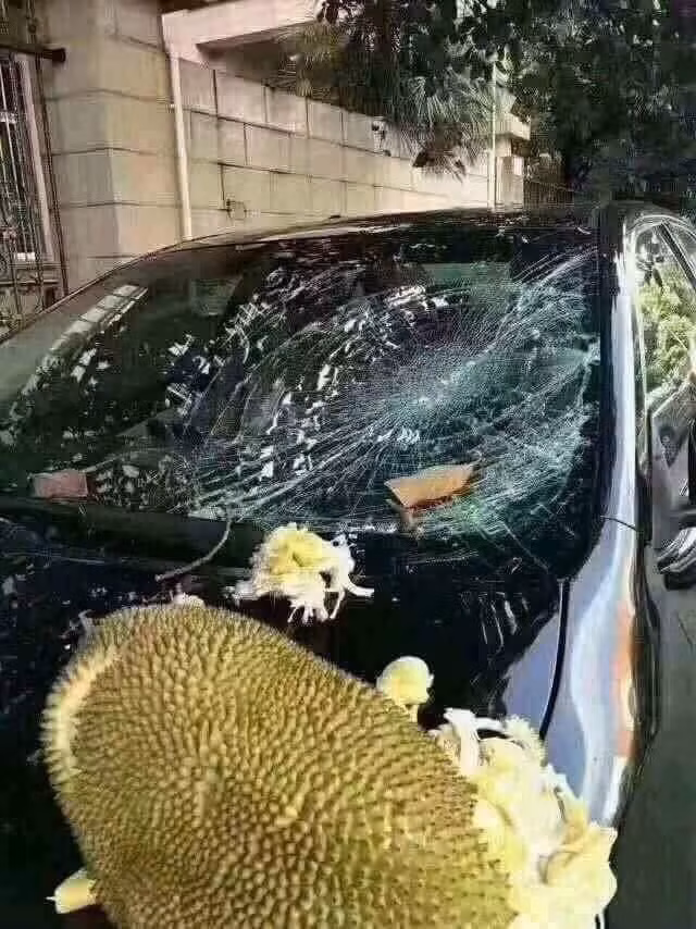 Cách đây ít giờ, mạng xã hội xôn xao chia sẻ hình ảnh một chiếc xe ô tô bị quả mít rơi trúng khiến kính xe vỡ nát.