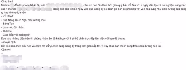 Cụ thể, sau 2 ngày thử việc, ‘khổ chủ’ nhận được một email từ nhân sự thông báo rằng cô không phù hợp và chưa thể đồng hành cùng công ty. Để có được quyết định này, nhân sự đã tham khảo ý kiến của các bộ phận làm việc trực tiếp với ‘khổ chủ’ trong công ty và dựa trên các tiêu chí như: kỷ luật, khả năng thích nghi với môi trường, sáng tạo, làm việc đội nhóm, thái độ giao tiếp với mọi người để đánh giá.