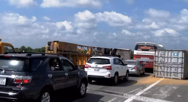 Khoảng 6g30 sáng nay 14-8, trên cao tốc TP.HCM - Trung Lương, một chiếc xe container lật ngang đường.