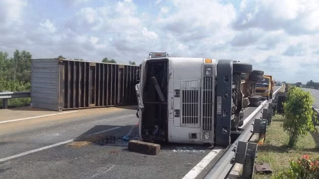 Tại hiện trường, mặt đường cao tốc bị hư hỏng do xe container cọ xát. Xe đầu kéo container lật ngang giữa đường, rơmooc văng ra khỏi xe méo mó, bể vỡ.