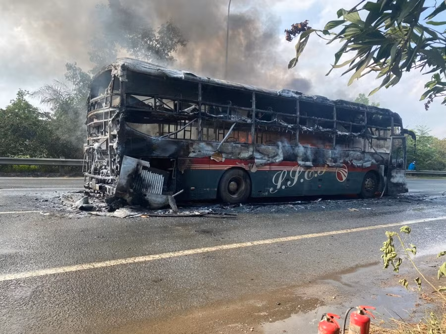 | Tại hiện trường xe khách bị thiêu rụi hoàn toàn. |