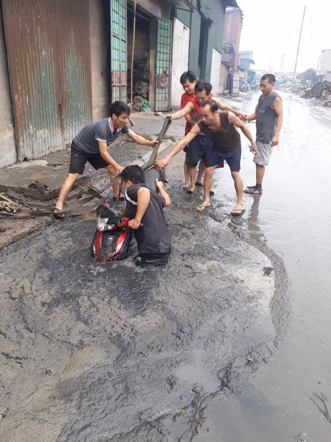 Trong ảnh, người đàn ông đang cố giữ vững chiếc xe máy ngập đầu trong vũng lầy. 4, 5 người đàn ông đứng bên trên loay hoay tìm cách trợ giúp.