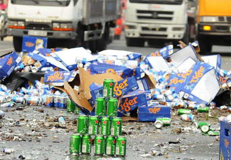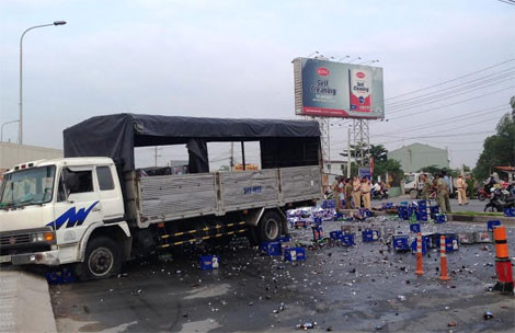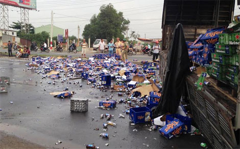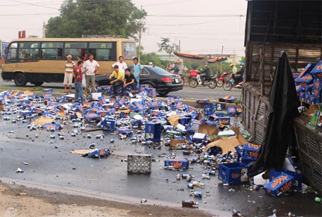 Chiếc xe lao qua trái tông vào dải phân cách rồi chắn ngang QL1. Hàng trăm thùng bia (bia lon và chai) từ trên xe rơi xuống đường. May mắn vụ tai nạn không gây thương vong về người, tài xế xe chở bia chỉ bị thương nhẹ.
