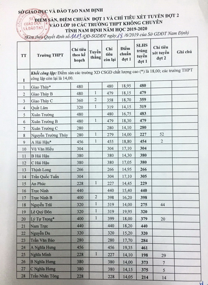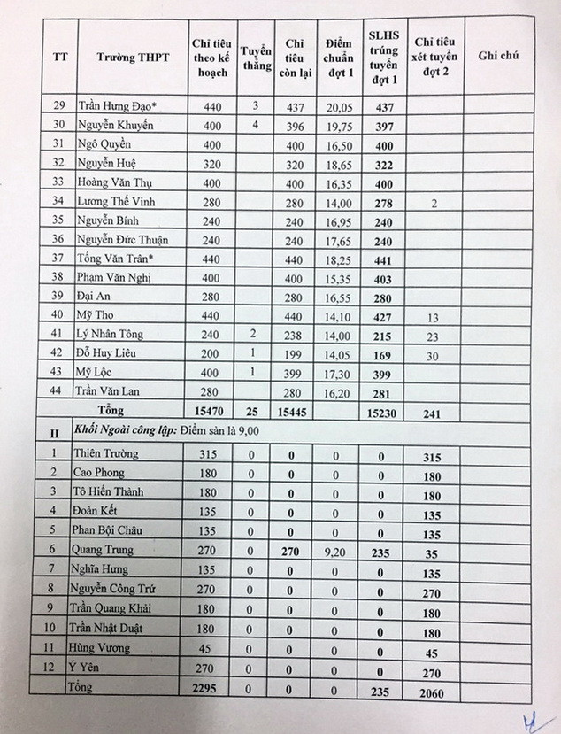 Tổng chỉ tiêu xét tuyển đợt 1 của khối trường công lập là 15.230. Như vậy, trên tổng số chỉ tiêu kế hoạch của khối là 15.470, các trường THPT công lập đã tuyển cơ bản đủ chỉ tiêu, chỉ còn lại 241 chỉ tiêu cho xét tuyển đợt 2.