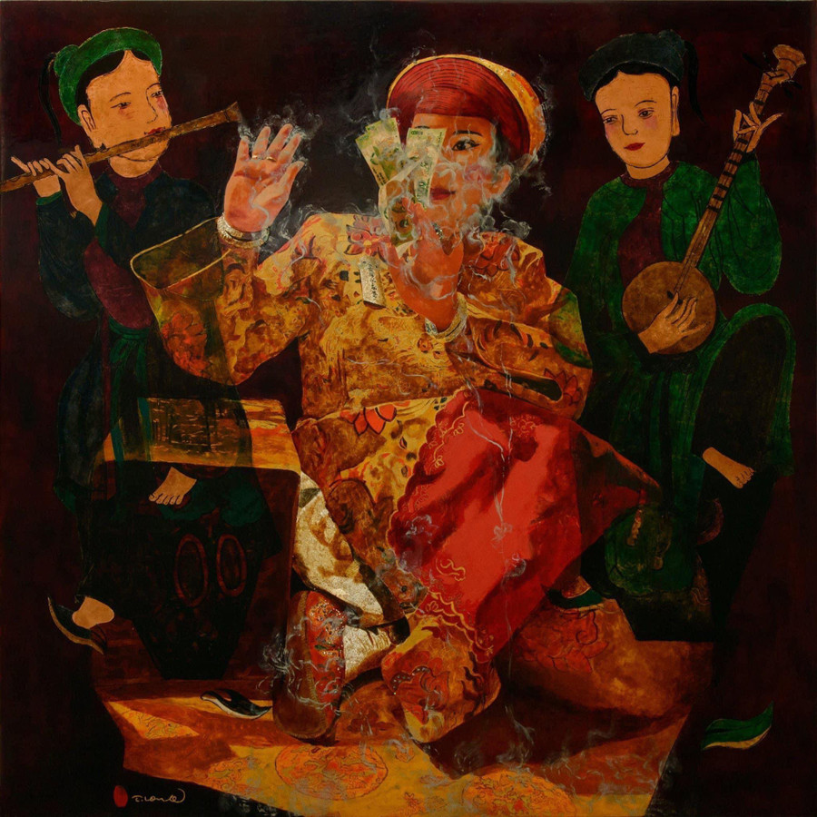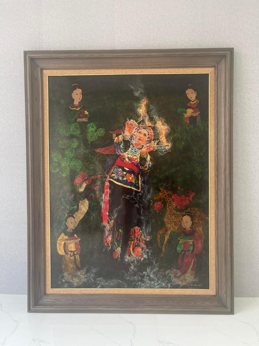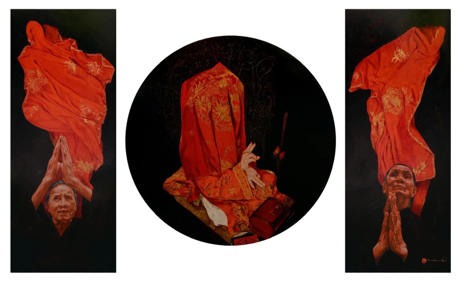 Họa sĩ Trần Tuấn Long đã lưu giữ những cảm xúc mong manh đó thành các tác phẩm hội họa, trên chất liệu sơn mài truyền thống để người xem có thể cảm nhận hết các cung bậc linh thiêng của tín ngưỡng và hội hoạ.