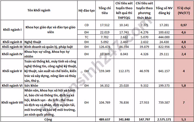 Khối ngành III (kinh doanh, quản lý và pháp luật) là nhóm ngành có số lượt nguyện vọng (NV) xét tuyển cao nhất, 822.956 NV, trong khi chỉ tiêu là 126.473.