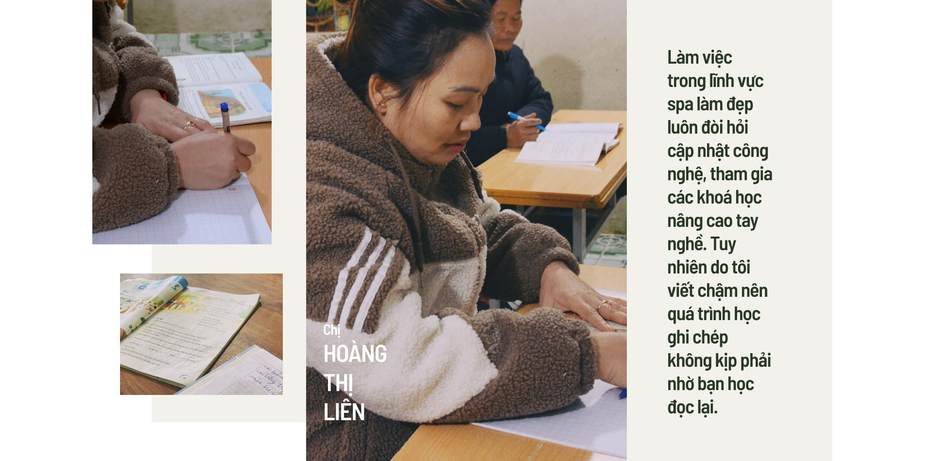 “Làm việc trong lĩnh vực spa làm đẹp luôn đòi hỏi cập nhật công nghệ, tham gia các khoá học nâng cao tay nghề. Tuy nhiên do tôi viết chậm nên quá trình học ghi chép không kịp phải nhờ bạn học đọc lại. Do đó, tôi đã tham gia học lớp xoá mù chữ”, chị Liên trải lòng.
