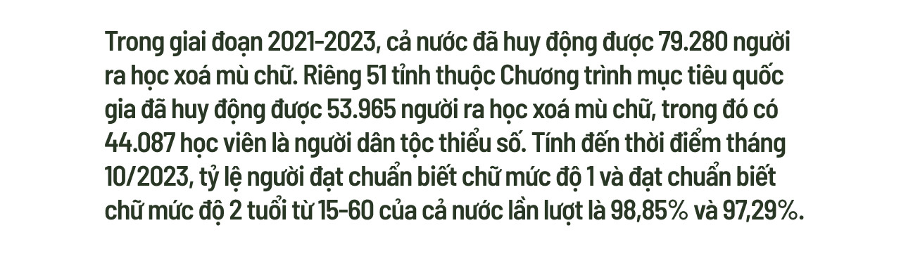 Việc tiếp cận con chữ giờ đây không còn là điều xa lạ với bà con nơi đây mà đã trở thành phòng trào ngày càng được lan rộng. Thành quả này không chỉ là sự nỗ lực của người dân mà còn là ý chí, đoàn kết, chung tay vào công tác xoá mù chữ của chính quyền, toàn ngành Giáo dục nơi đây.
