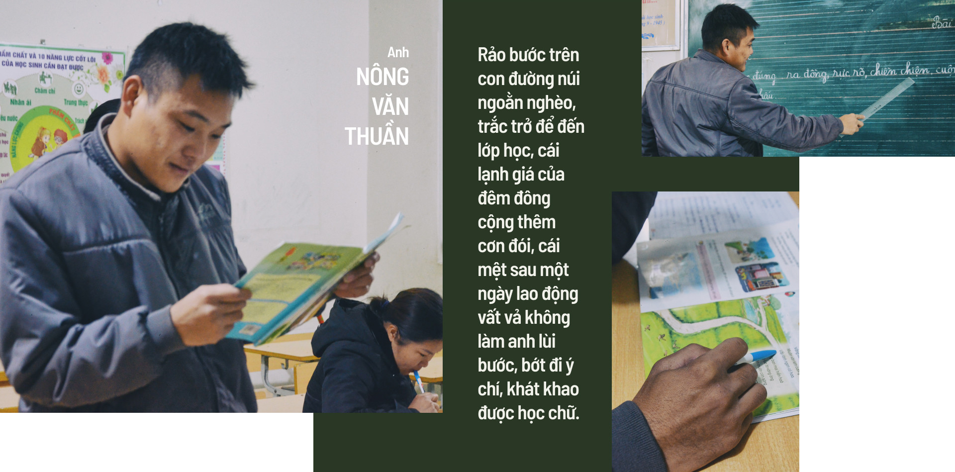 18 giờ tối, anh Nông Văn Thuần ở thôn Khòn Cải, xã Liên Hội, huyện Văn Quan, tỉnh Lạng Sơn kết thúc một ngày làm nương và di chuyển về nhà. Không kịp ăn cơm, thay đồ, anh đến lớp học xoá mù chữ trong bộ đồ lao động cùng hành trang là cuốn sách giáo khoa, quyển vở ô ly và chiếc bút bi.