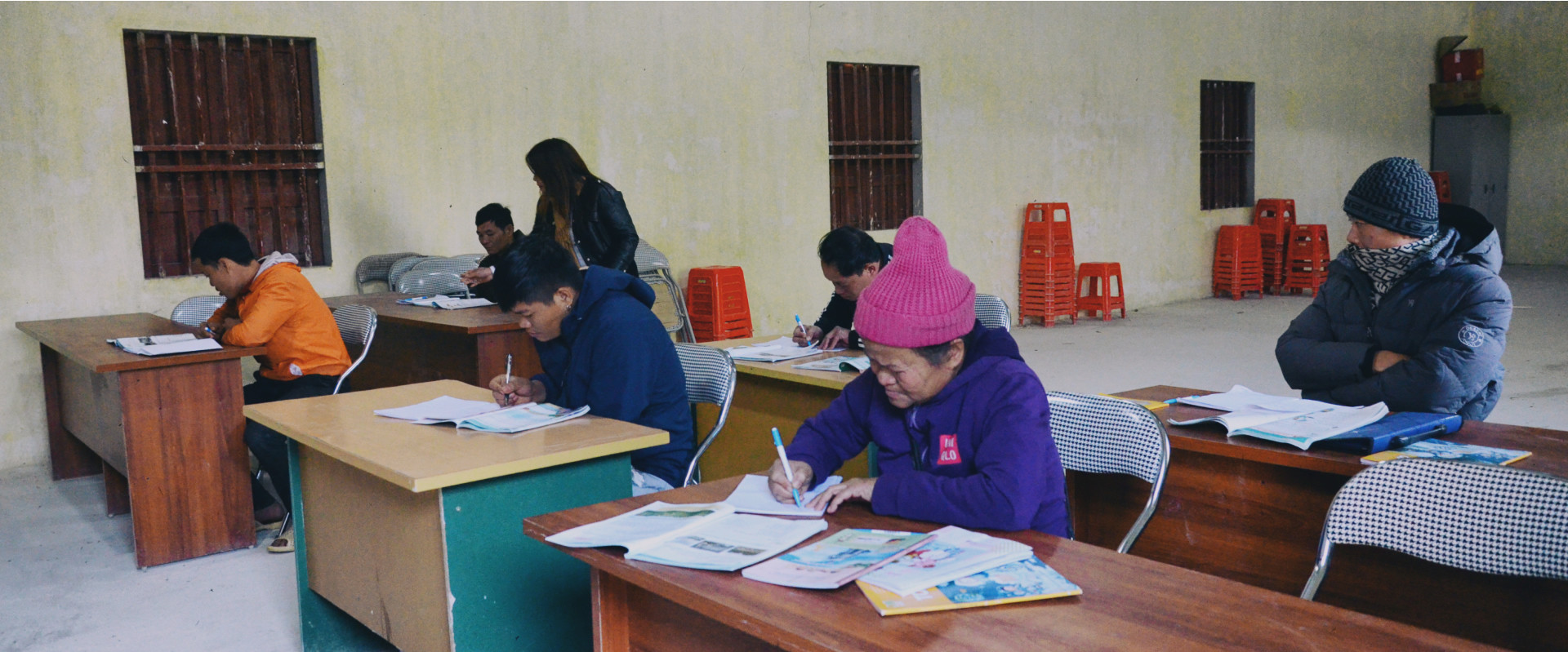 Điều bất ngờ, lớp học này không phải dành cho những cô, cậu học trò ở độ tuổi tiểu học mà là những bà con từ 30 đến 55 tuổi – độ tuổi ngày “bán mặt cho đất, bán lưng cho trời” để mưu sinh, tối về cắp sách lên lớp kiếm con chữ.