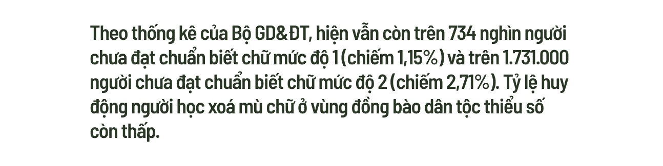 “Hiện ở xã tôi vẫn còn gần 80 người chưa biết chữ, trong đó có những người đã ngoài 70 tuổi ngại đi học vì không biết sử dụng phương tiện đi lại, tuổi cao lười học; một số đi làm ăn xa hay đang tuổi sinh nở nên khó khăn trong việc tham gia lớp học. Do đó, chúng tôi tiếp tục rà soát và khảo sát nhu cầu của người dân để có phương án tổ chức mới lớp phù hợp”, ông Thoại cho biết.