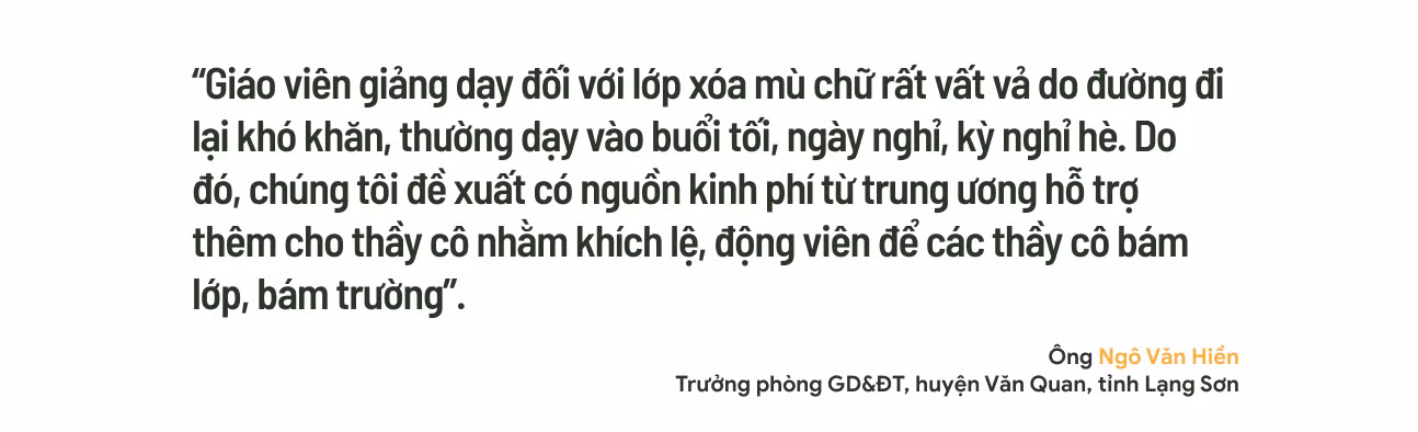 Ngoài những thuận lợi đến từ sự đồng lòng, quyết tâm đẩy nạn mù chữ, ông Hiền cho biết huyện Văn Quan là huyện miền núi nghèo, việc sử dụng nguồn kinh phí địa phương chi trả cho giáo viên thực hiện hết sức khó khăn.