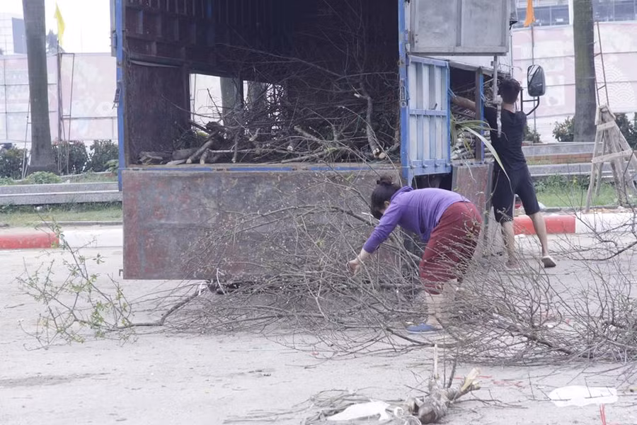 | Đào cây được người dân cắt cành để chuyển về vườn. |