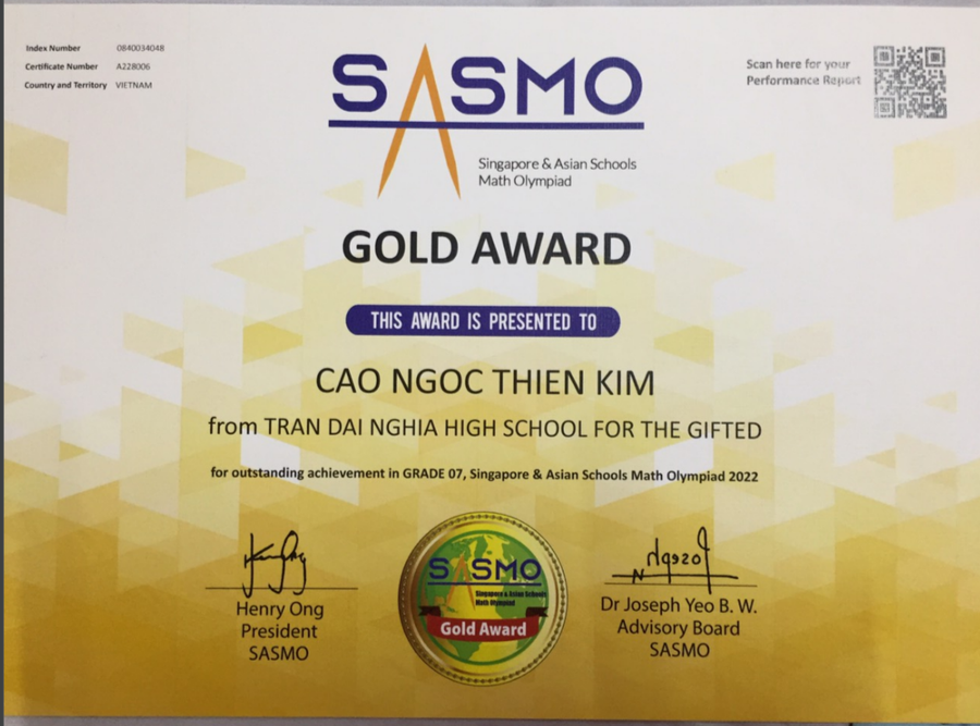 Bạn Cao Ngọc Thiên Kim - lớp 8 cựu học sinh chuyên Trần Đại Nghĩa, theo học Toán tư duy Singapore với Geniebook từ năm 2021 đã đạt giải Vàng trong kỳ thi Olympic Toán học Singapore và Châu Á - SASMO 2022.