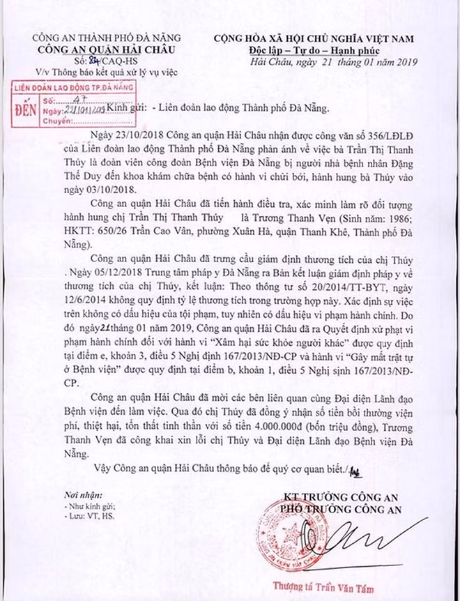 Kết quả giám định thương tích của chị Thúy xác định, sự việc không có dấu hiệu của phạm tội, tuy nhiên có dấu hiệu vi phạm hành chính.