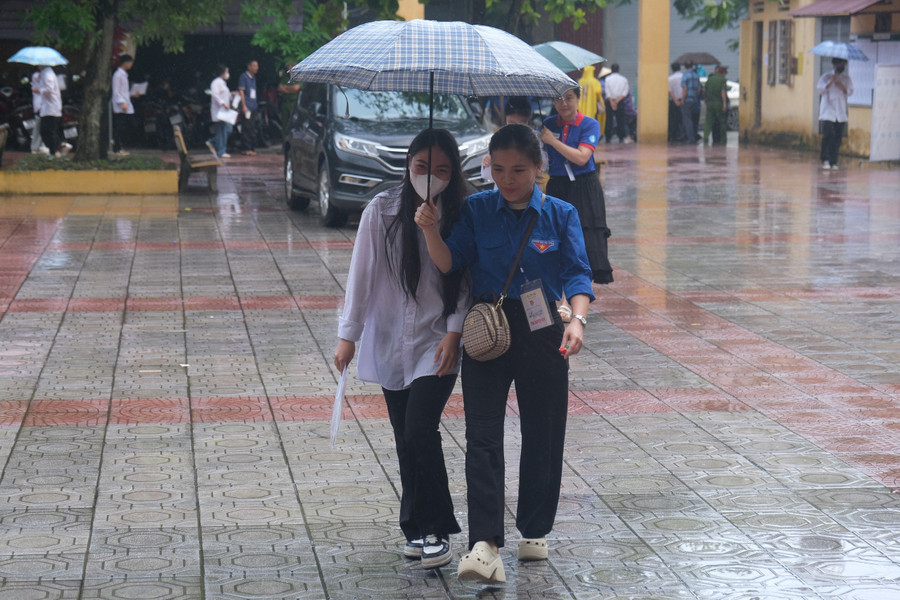 | Cơn mưa khiến nhiều thí sinh bất ngờ nhưng được tình nguyện viên hỗ trợ kịp thời. |