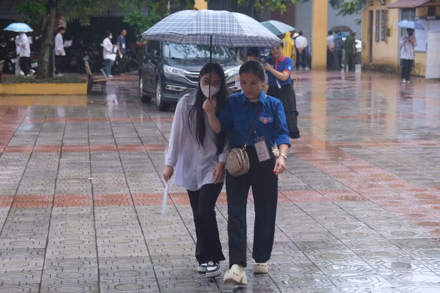 Ghi nhận tại điểm thi Trường THPT Nguyễn Du (TP. Bắc Ninh, tỉnh Bắc Ninh), khoảng 6h15 sáng ngày 27/6, một cơn mưa rào nặng hạt bất ngờ khiến nhiều thí sinh khó khăn trong việc di chuyển vào khu vực phòng thi.