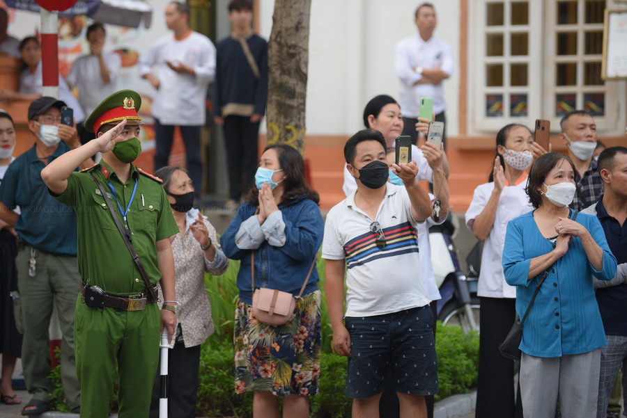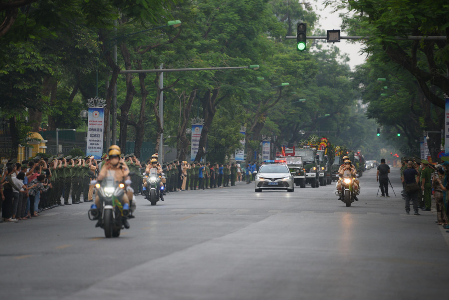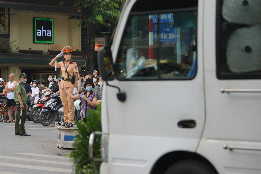 | Tại các tuyến đường di quan, lực lượng đoàn viên thanh niên Thủ đô mặc áo xanh tình nguyện kết hợp với lực lượng công an Thủ đô tổ chức nhiều hàng dài để chào tiễn biệt các liệt sỹ. |