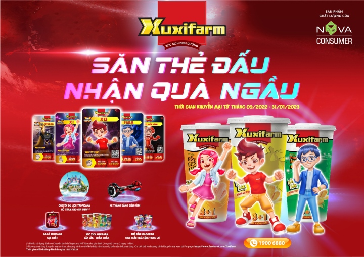 Bên cạnh đó, mẹ và bé có thể mua các sản phẩm nhà Xuxifarm và sưu tầm các thẻ bài đấu đặc biệt để nhận được hàng ngàn quà ngầu như: Chuyến du lịch tại NovaWorld Ho Tram cho cả gia đình, Xe thăng bằng siêu đỉnh, Balo Xuxifarm cực chất, Thẻ đấu Hologram cool ngầu, Xúc xích Xuxifarm Lắk Lắk Chấm Chấm ngon lành.