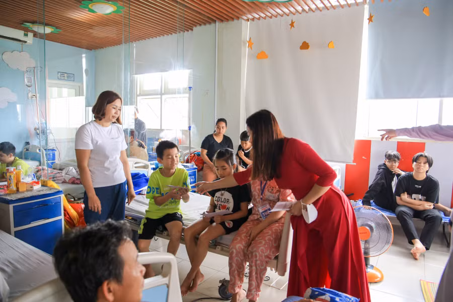 | Các giáo viên Trường Tiểu học Trần Quốc Toản hỏi thăm, động viên các em học sinh cũng như các bậc phụ huynh đang chăm sóc con em mình tại bệnh viện. |