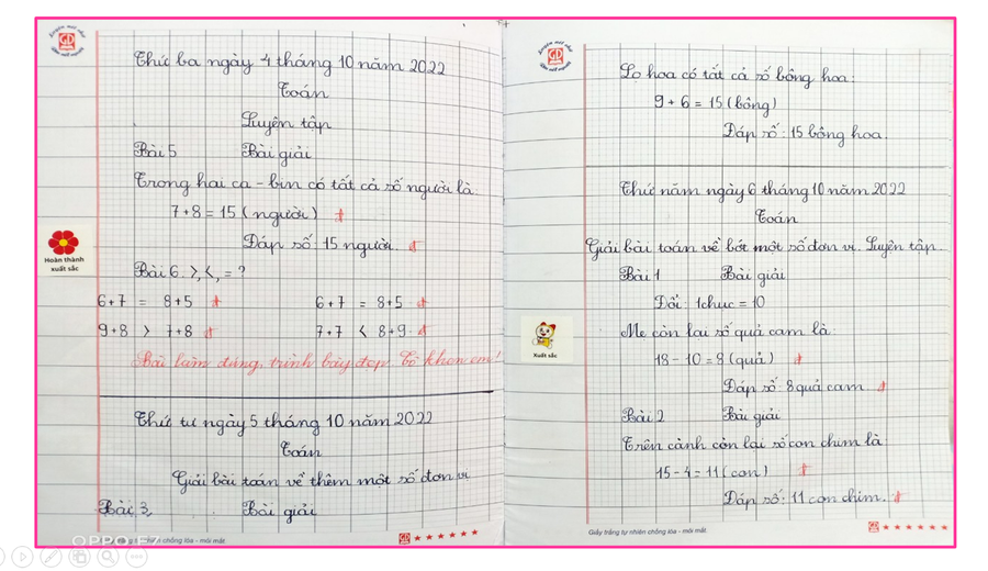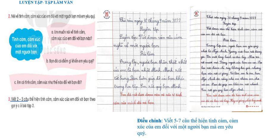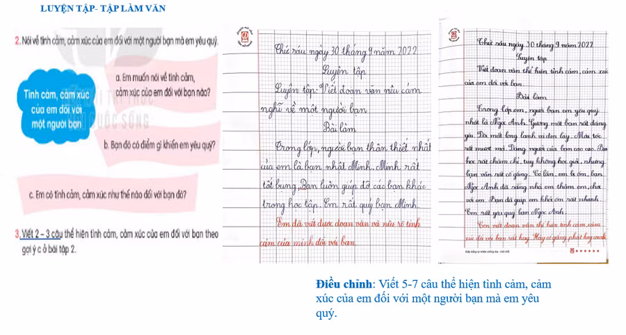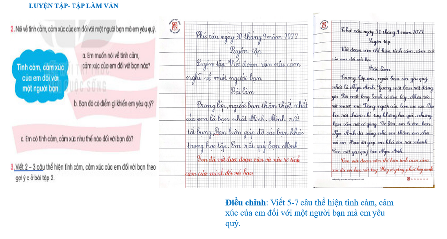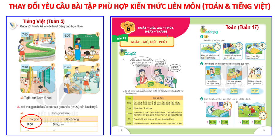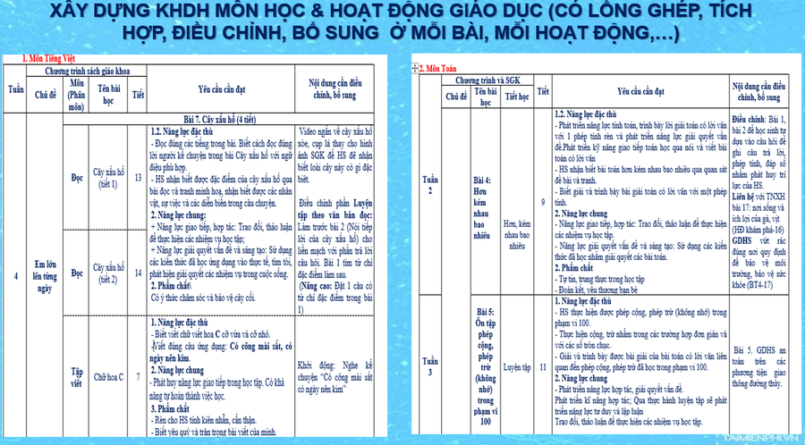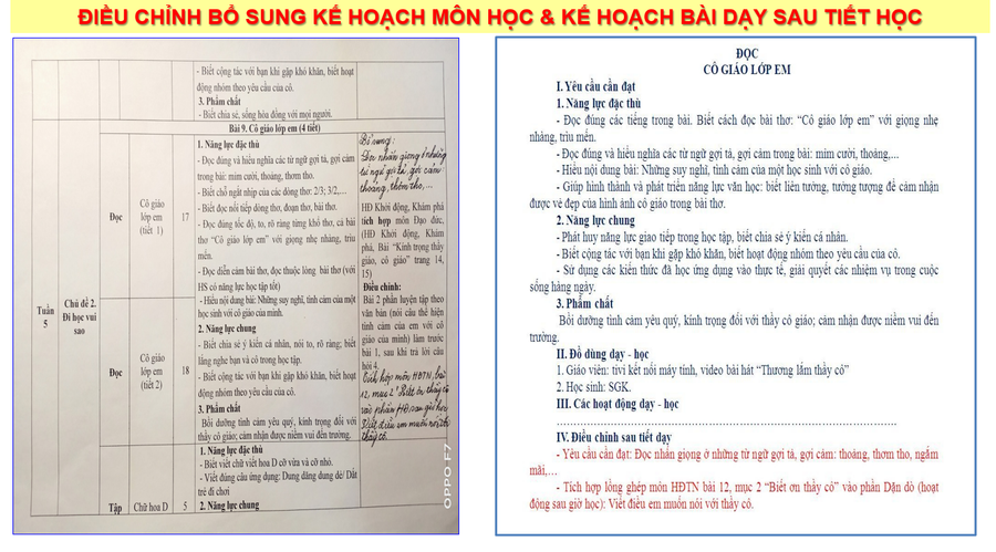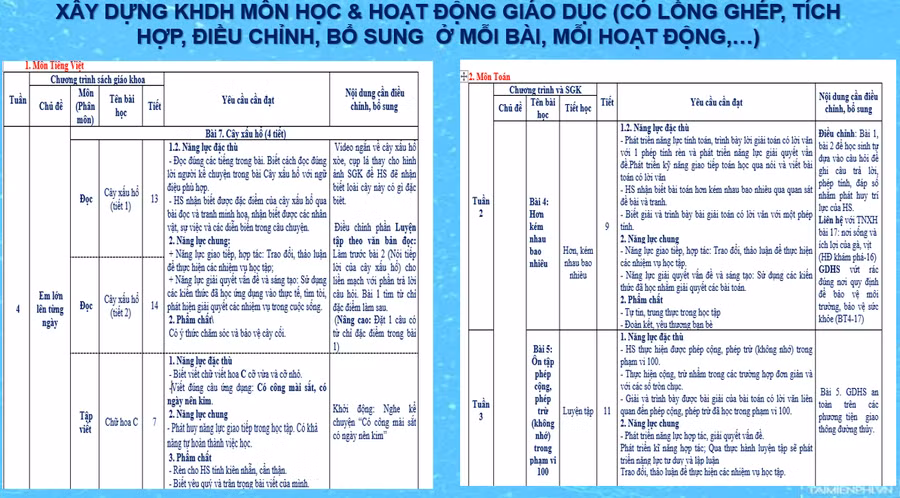 Không dừng lại ở việc xây dựng kế hoạch dạy học các môn học và hoạt động giáo dục trong khung chương trình, các đồng chí đã chia sẻ việc áp dụng kế hoạch vào thực tiễn bằng “Kịch bản” của mỗi giờ lên lớp. Khi xây dựng kế hoạch bài dạy, các đồng chí đã dựa vào yêu cầu cần đạt về năng lực và phẩm chất, cấu trúc bài học sách giáo khoa để lồng ghép tích hợp nội môn, liên môn; điều chỉnh, bổ sung ở mỗi bài, mỗi hoạt động để phù hợp với thời gian thực tế cũng như phù hợp nhà trường, địa phương. Bên cạnh việc dạy tích hợp các đồng chí cũng thể hiện rõ dạy theo cách phân hóa đối tượng học sinh khi điều chỉnh yêu cầu bài tập môn Toán, khắc sâu kiến thức cho học sinh về tên gọi khác của các kiểu câu ở môn Tiếng Việt 2 - Bộ sách Cánh diều và bộ sách Kết nối tri thức với cuộc sống.